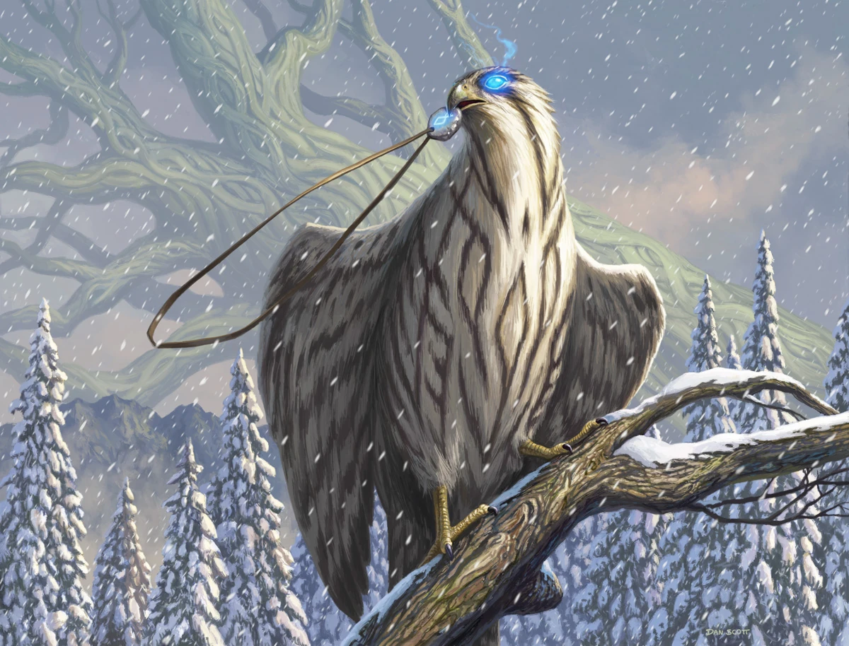 Aesthir are giant birds that were used by the Kjeldorans of Dominaria's Ice Age as flying mounts for their elite skyknights. Aesthir were highly prized by the Kjeldorans, with mistreatment or disrespect towards them being heavily frowned upon. Though the cold-weather breed gradually became extinct after the Ice Age ended and their natural habitat disappeared, a breed that could survive warmer weather was bred by Kjeldorans and exists to the modern day.[3][4]
