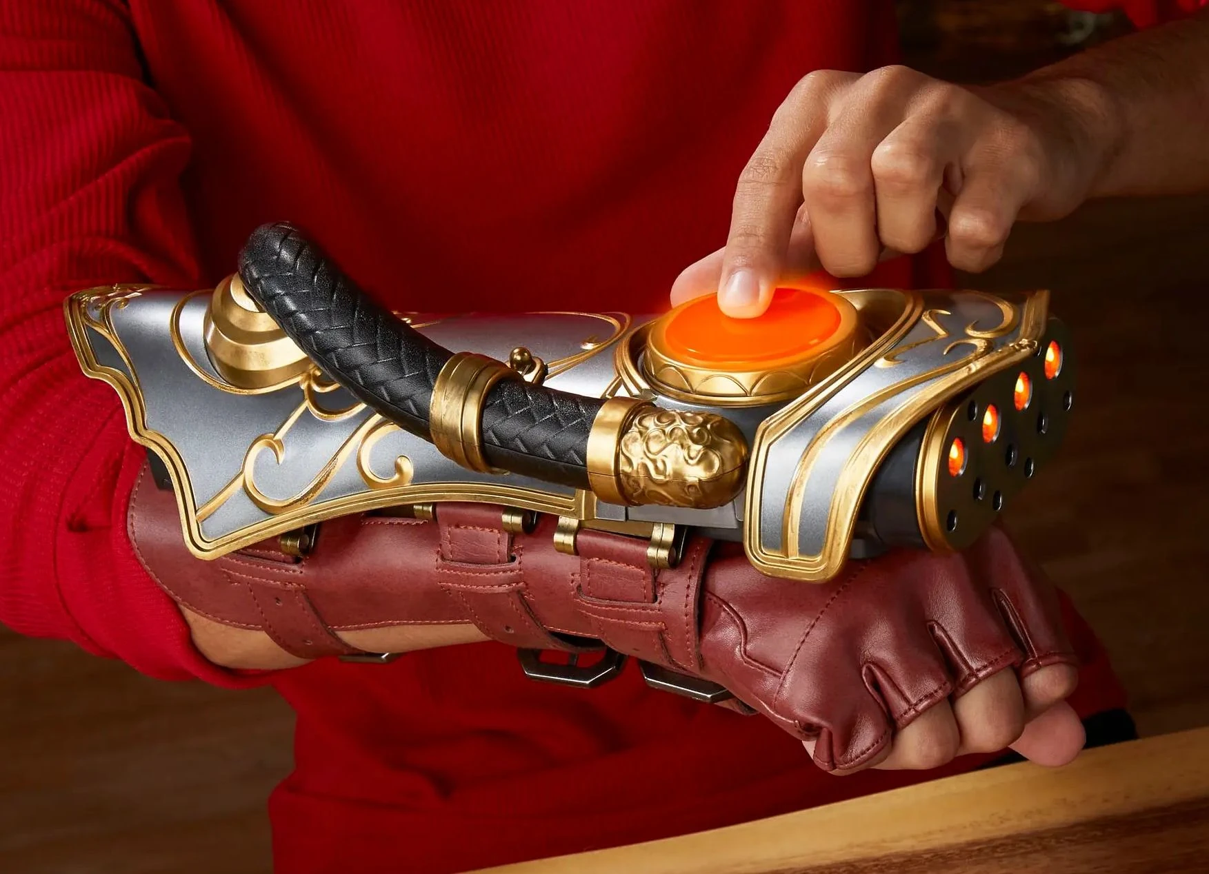 In 2023, a Premium Roleplay Collectible became available from Hasbro: Chandra's Pyromancer Gauntlet. The gauntlet features multiple electronic effects with lights and sounds, as well as misting effects. This wearable gauntlet includes a display stand, refill bottle (for the misting effect), as well as three pairs of gloves and three replacement wicks. An alternate art Pyromancer's Gauntlet card is also included. The Magic: The Gathering Chandra Pyromancer's Gauntlet Roleplay Collectible is priced at $299.99.[8]