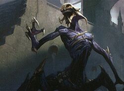 Several of these, like the Grim Strider and the Scrounger of Souls, have elongated forelimbs and a mask-like bone plate instead of a face with a glowing rhombus of light modeled after an eye in its center. Other Horrors are spawned from enchantments or are warped inhabitants of the plane, like the Wasp of the Bitter End.
