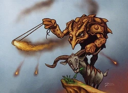 Ishi-Ishi was a renowned crack shot and constantly used his sling to hurl flaming pebbles at the kami invaders of his mountain home. He was fond of goats: whether as steeds or dinner (or both), it's not entirely clear. He once flew over the Sokenzan Mountains on his goat mount and found the persimmon tree of plenty.[2] He was eventually killed by the Mountain Kami, and his body incinerated. The akki carried off his shell, but they left an inscription at the cave of his demise: "Here fell Ishi-Ishi, King of the Flaming Pebbles, Scourge of the Mountain Kami, Lover of Goats. May his shell never burn."