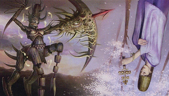 Jaraku is a meddlesome kami of manipulations residing in the body of a simple wizard. Its appearance has a vague outline similar to that of a centaur in that it has four legs and a humanoid torso. Its legs are segmented with small connections between the parts while one of its arms has the appearance of a large crossbow with an eye on it and a blade at the end. Its head is like a cylinder with a face and horns growing around it.