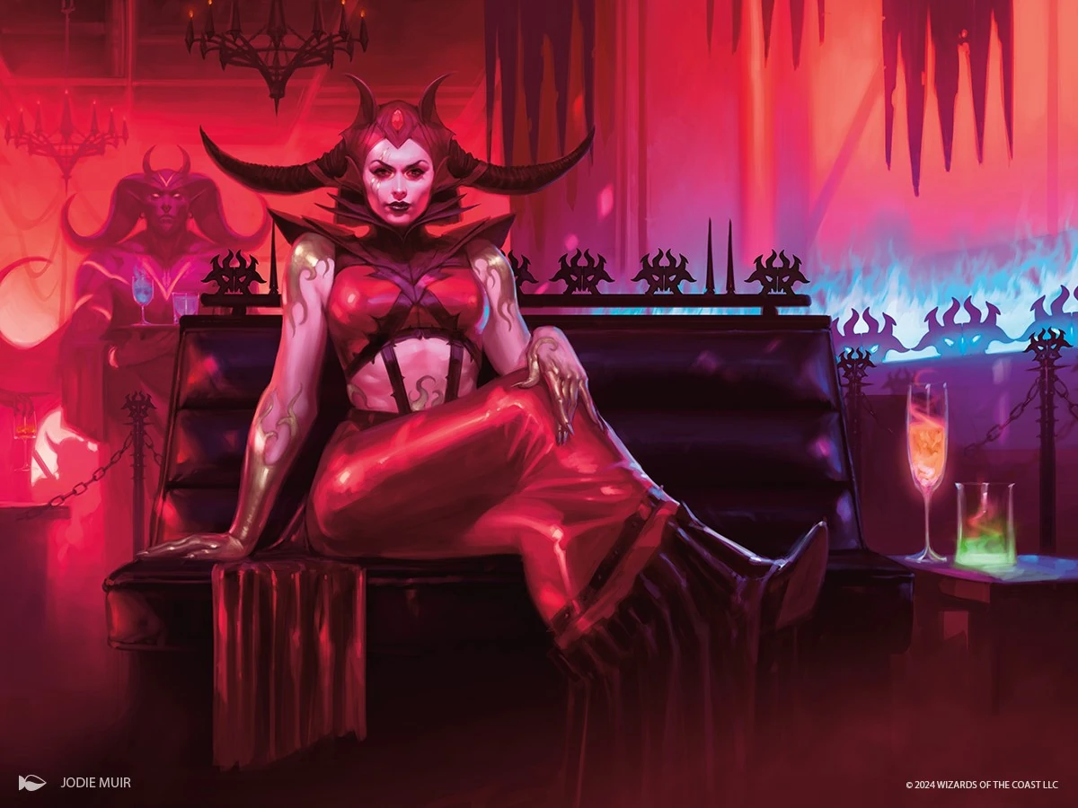 A year and some months following the Invasion, she was the only representative for the Rakdos at the celebration at Karlov Manor.[6] She was conspicuously absent when Zegana was assassinated during the celebration, but did submit to questioning by Azorius lawmages afterward.[11][3] She hired the Rakdos assassin Massacre Girl to kill Alquist Proft as a message to the Ravnican Agency of Magicological Investigations to stay out of guild business.[12] Kaya Cassir and Kellan later visited her for further questioning, and she directed them to the original text of the Guildpact at Vitu-Ghazi, which seemingly implicated Rakdos himself. However, when their partner Agrus Kos became suspicious and came to investigate at Rix Maadi, Judith revealed that she had deliberately misdirected them in the hopes that the crime would be pinned on Rakdos and she could take his place.[13] She then imprisoned Kos in a crystal skull to prevent him from interfering. She was later invited to Vitu-Ghazi by Alquist Proft to learn the truth of the murders, where the detective revealed that Oba, the central dryad of Trostani, had organized them in retribution for those she considered traitors to the plane during the Invasion.[14] When Oba attacked the guild leaders, Judith ran away but was stopped by Massacre Girl, who blamed Judith for leaving her to the Boros and attacked her with a knife.[15] Judith's whereabouts afterward are unknown.[4]
