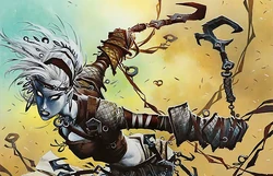 Khali and her twin brother Sha'heel joined Nissa Revane and the three humans Hamadi, Bahkut, and Alira in hunting Eldrazi. As an experienced hookmaster, Khali and her brother led the climb up the gravity fields, and through the maze of floating boulders. Nissa watched the brother and sister communicate with a series of intricate hand gestures as they made their way deeper into the gravity field. Dozens of massive boulders moved in apparent chaos as they collided and rolled. Khali and Sha'heel moved their party along, picking through the hazards with ease. Their ropes were like magical extensions of their arms, as they flicked out their lines to catch passing rock faces or swung onto new boulders as they floated by.