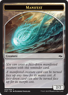 Manifest card (Put it onto the battlefield face down as a 2/2 creature. Turn it face up any time for its mana cost if it's a creature card.) Manifest dread card (Look at the top two cards of your library. Put one onto the battlefield face down as a 2/2 creature and the other into your graveyard. Turn it face up any time for its mana cost if it’s a creature card.) |
