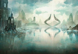 Considering the Meditation Plane the site of his greatest triumph, Bolas thought it a fitting place for him to ruminate over his plans. To give himself a focal point on which to center his meditation, he chose a spot at the center of a vast span where no islands broke the surface. Here, he erected two gigantic curved horns so they emerged from the waters as if a gargantuan dragon lay sleeping beneath.[6]