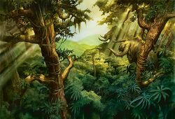 In the lower elevations, the jungle is the undisputed king. With heavy, intermittent rainfall as the lifeblood of the jungle, the rampant vegetation is in a constant race, always clawing upwards in the competition for sunshine. The canopy of leaves is laced together by massive lianas — thick, woody vines that connect the trees and can grow up to five feet in diameter. Animals, humans, and elves use these lianas as highways to travel across the jungle. Amid the massive buttress roots are termites, fungi, and oversized logger-ants who hunt by scent using coordinated movements and can easily take down an unsuspecting human or elf.[4] A permanent, pale mist known as the Whitecover hangs over the rainforest, punctured by ranges of steeply sloped mountains.