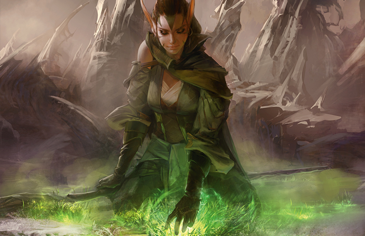 In her original origin, her planar travels took her to the sunny world of Lorwyn where elves thrived and ruled uncontested. There she met elves who fully embraced their role as nature's pinnacle, using life magic and its deadly shadow to assert their primacy. This encounter led Nissa to experiment with black mana on her terms in secret, using it to complement her elvish teachings.