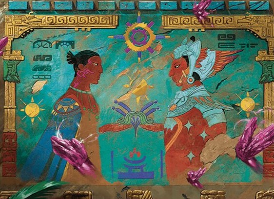 The Oltec have not had significant contact with the Sun Empire since the Sun Empire's ancestors first emerged on Ixalan's surface.[3] Though they are now the Oltec, they — and all humans — were once the Komon Winaq, or the Fifth People.[5] In their conception of the world, if humanity persists, so does the Fifth Age, and so, too, are they proven to be the chosen favorites of Chimil.
