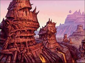 Vulshok barbarians live there, working their forges for trade. Goblins reside in the Chain as well. Kuldotha, the Great Furnace, lies on the inside of a gargantuan hollow mountain. Molten metal come from the bowels of Kuldotha, and it is the hallowed ground and home for the Cult of Krark, as well as the worshippers of the Steel Mother. The Red Lacuna was somewhere within the Oxidda Chain.