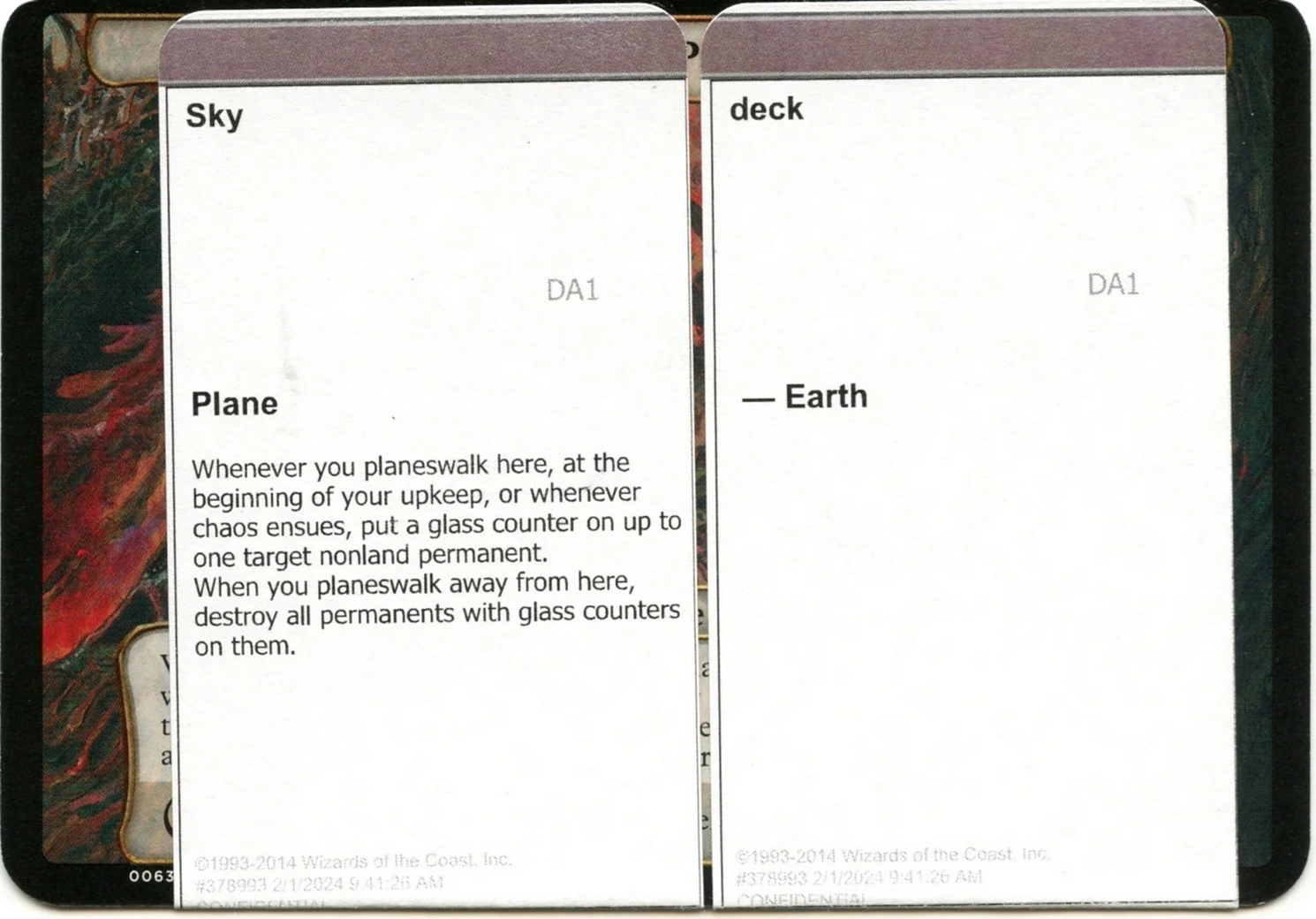 Sky deck | Earth | Whenever you planeswalk here, at the beginning of your upkeep, or whenever chaos ensues, put a glass counter on up to one target nonland permanent. When you planeswalk away from here, destroy all permanents with glass counters on them. |