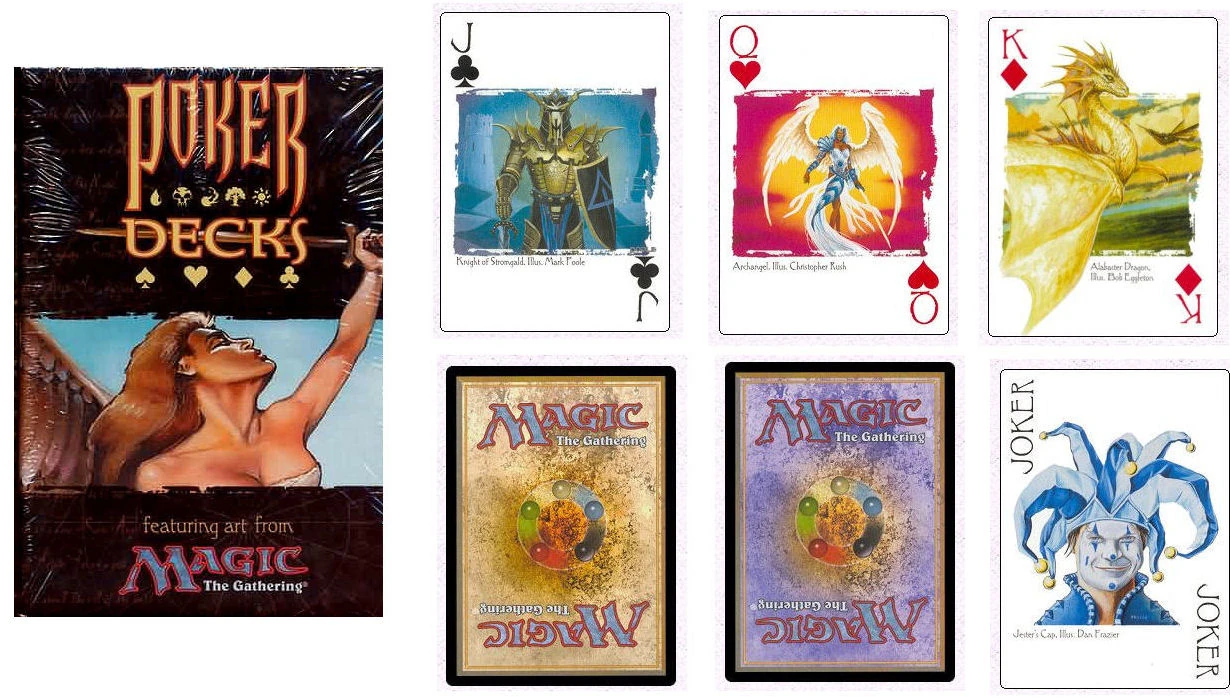 In August 1998 Wizards of the Coast released a poker deck box which includes two complete poker decks plus two advertisement cards which promote other Magic products. The decks each consist of 52 standard playing cards plus 2 jokers for a total of 54 cards and can be distinguished by their different backsides, red and blue.[3] The face cards all have classic artwork on them—the Kings are Dragons; the Queens are Angels, and the Jacks are Knights, and the Jokers are Jesters.