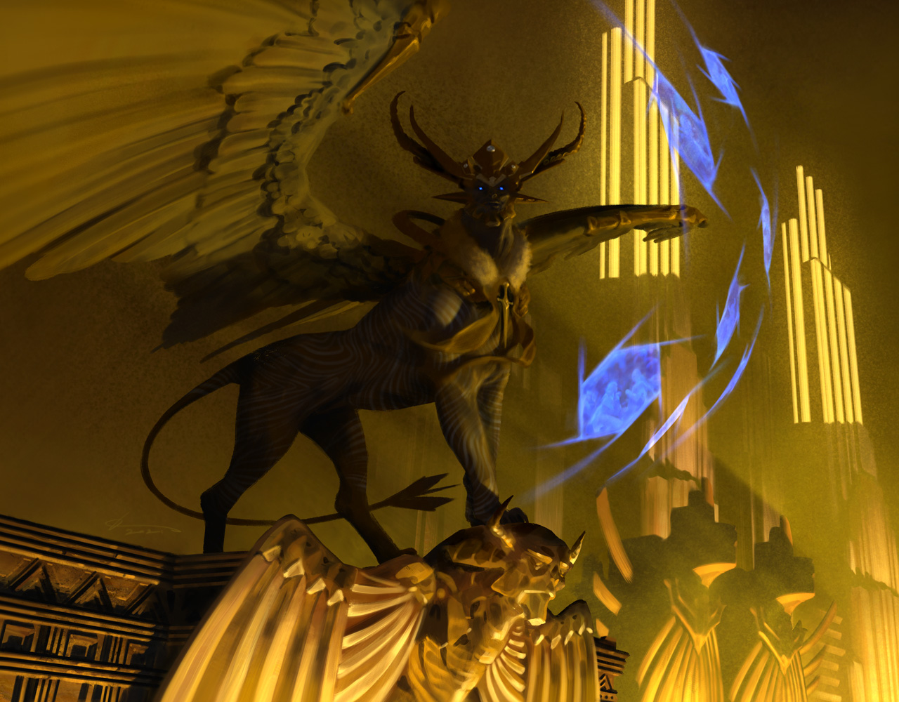 The sphinxes of Old Capenna were never many. Territorial and vain, they competed over public acclaim, fear, and devotion, crafting prophetic forecasts to drive the masses to their temples. As a young sphinx, Raffine could count on half a paw the number of her kind she knew personally: her mother, who cast her out when she could fly; her rival, whose augury contradicted her own as much as Raffine's did hers; and her lover, whose name and face Raffine can no longer remember.