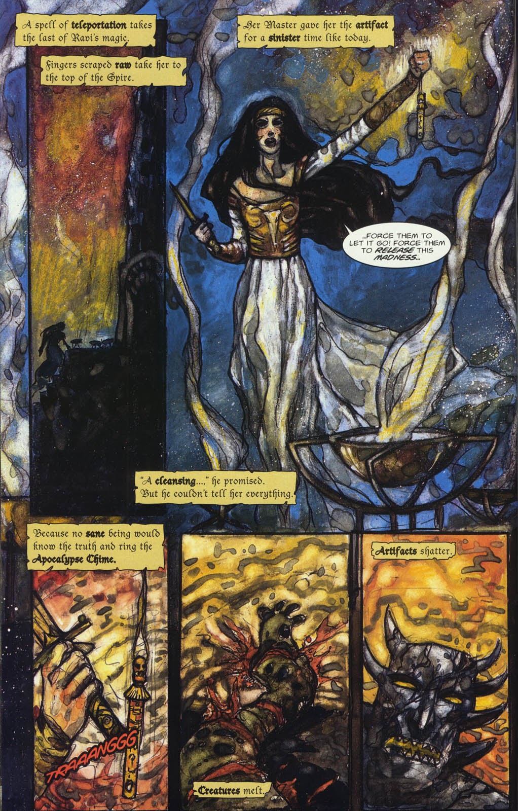 An unspecified amount of time later, Ravi has accepted her magical inclination, becoming a planeswalker that used green, red, and black mana. She was affiliated with the Tolgath, a group of young planeswalkers opposed by the rival Ancients. The long war between the two factions reached its peak on the backwater plane of Ulgrotha. The master of Ravi had given her a mighty artifact, the Apocalypse Chime, telling her to use it in only the most sinister of times and promising her it would cleanse the world. However, her master didn't tell everything, because nobody who would have known the effects of the chime, would have rung it. At the peak of the Great War, hoping to stop the killing, Ravi rang the chime and destroyed both parties, resulting in the Great Destruction that formed the Dead Zone by disrupting the world's mana channels and killing almost all creatures on the plane. The damage propagated throughout various planes, in effect creating some sort of connection between Ulgrotha, Dominaria and Kamigawa. As instructed, Ravi hid herself in a magical coffin in the Basalt Spire, to escape the effects of the Chime; however, her master never told to the girl how to open the coffin. Being a wizard based on life and nature, feeling her ties to the land ripped away drove her to madness, and she was left with a suffocating feeling of solitude. Even though the coffin protected her against the backlash of the Chime, feeling all of her connections and relations fragment to nothingness caused her to regress into an unstable state. Trapped, Ravi lay in stasis, awake, unable to dream, aware of every passing second for the centuries she was locked within the artifact. Her spirit was rapidly broken, and claustrophobia set in. Madness does not even begin to describe the state of her mentality.[3]