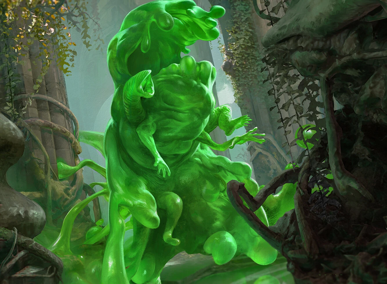 Driven only by instinct and hunger, Slurrk consumes every living being in its path. An ancient ooze, it has devoured countless beings to the point that it has begun to lose its slime-like viscosity. The upper portions of its body, as it were, have begun to take the form of the creatures it has consumed. Limbs, faces, and other extremities have solidified, creating a truly nauseating being to behold.