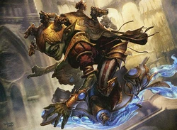 Squelch dashed under the shields of the battalion of Boros soldiers facing them. Squelch hurled himself onto the back of an armored war beast, then pulled a metal spike from an unseen pocket and jammed it into the top of the creature's head before jumping away.