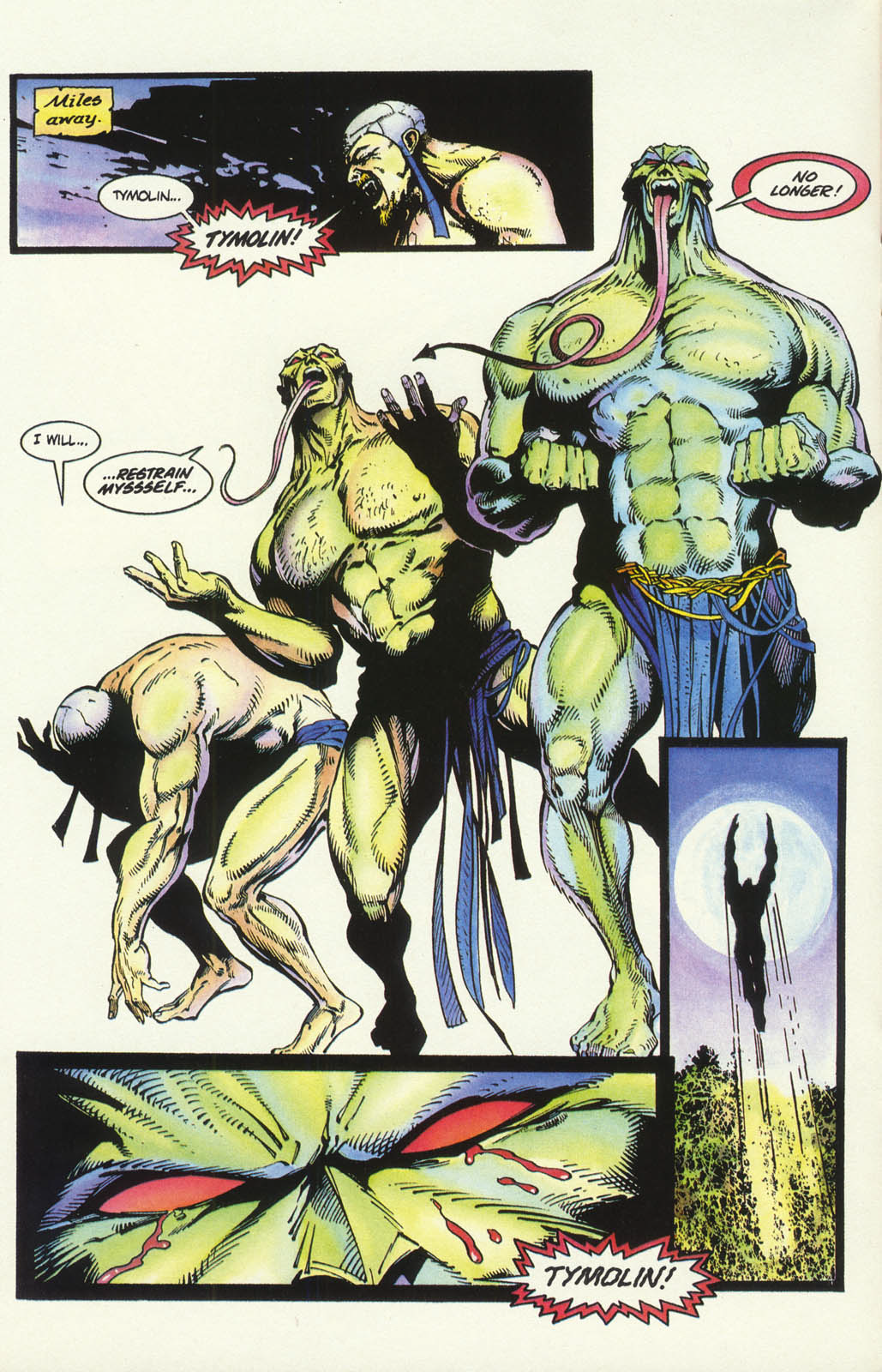 Alone in Havenwood, Tev became infuriated at the audacity of the attack. His grip on humanity began to slip and his image shifted from that of an old man to a more draconic visage. In his search for Tymolin, he happened upon the elven master-scout Loren under attack by the druid Morgan and several thallids. Showing his loss of isolationist stance, Tev incinerated the thallids, leaving Loren alone to fight Morgan. Tev did this not out of compassion for Morgan, but to make the fight fair, and commented that if it had been a single thallid and four elves the elves would now be dead.
