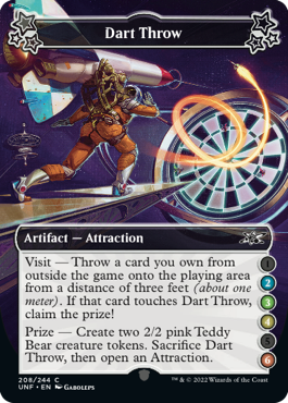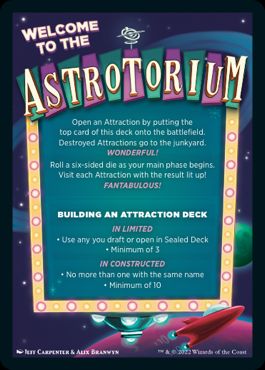 Unfinity introduces attractions. Attractions represent top-down tropes from carnivals, amusement parks, and circuses (e.g. rides, games, and stands). Attractions are kept in a separate deck, much like Contraptions, and they don't have normal Magic card backs. The card backs welcome you to the "Astrotorium" and provide the rules for building an attraction deck.