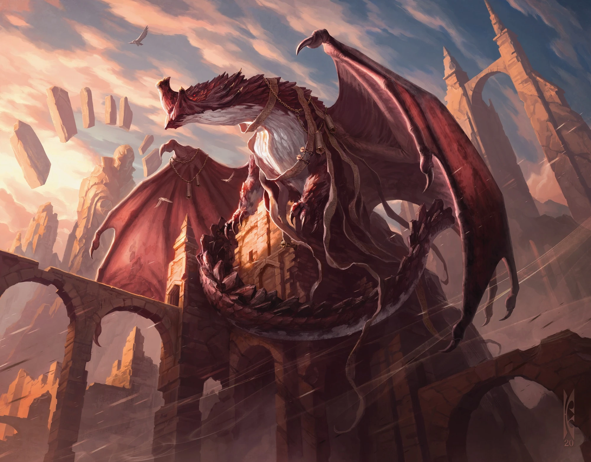 At the birth of the plane, as the mana of two planes overlapped in conflicting ways, many forms of life adapted to the new structure, and many new forms of life were spawned.[4] Five particularly powerful vortices of overlapping mana became luminous spheres, from which were hatched five dragons. These dragons have become emblems of the magic of the plane, living symbols of the clashing forces of the five dichotomies.