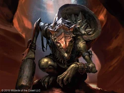 Zada took over the tribe, directing them to prepare for survival in a world rapidly consumed by the Eldrazi. She reasoned that places already drained of their power would not be bothered again by the monstrous broods, so the goblins established settlements in lands that had already been desiccated by Ulamog. Looking for ways to build secure shelter amid the brittle white residue of Akoum's rocky ground, the goblins developed domes that hung from stone spires or clung to sides of cliffs and experimented with building on a solid slab constructed amid the chalky waste.[2] Continuing the practice she began when she dispatched Tuktuk, Zada now grinds hedrons to dust and consumes them, hoping to absorb their power.[3]